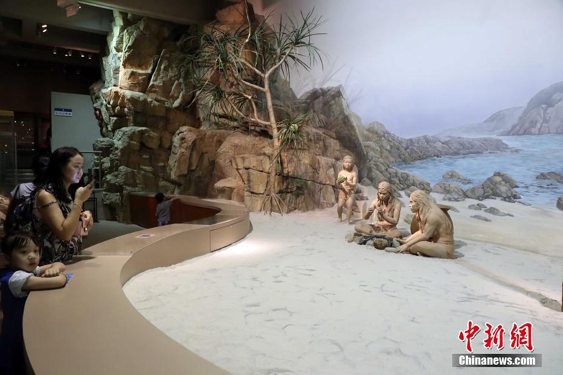 展區生動地介紹以考古成果再現了6000年前的新石器時代人類在香港地區活動情況。42米長的沙灘場景展示了古代先民做飯、覓食、休息的生活場景,讓參觀者了解到漫長歷史中的人類生活片斷。中新社記者 洪少葵 攝