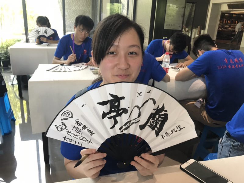 紹興團同學在蘭庭參觀時,在扇子上寫下「不忘此生」。
