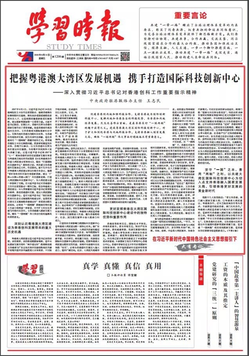 我辦主任王志民8月31日在《學習時報》上撰文《把握粵港澳大灣區發展機遇 攜手打造國際科技創新中心》,以下為全文: