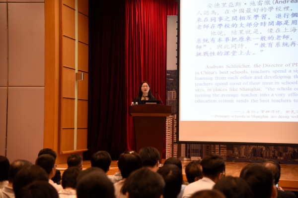 上海市教委教研室副主任王月芬作關於上海教育改革的專題報告。(圖片來源:中央政府駐港聯絡辦)