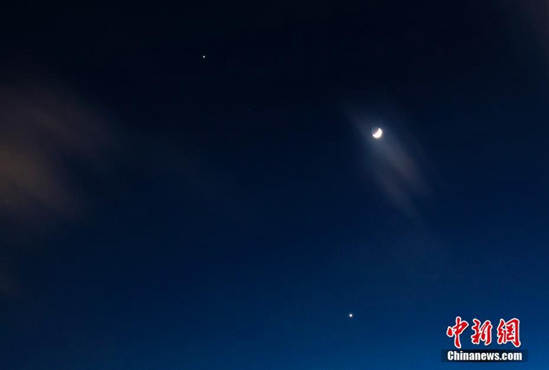 9月13日晚,香港夜空上演「雙星伴月」的美麗天象。在西南方上空,金星(月亮下方)和木星(月亮左上方)陪伴在一鉤彎月的兩旁,形成一個大致的等腰三角形。金星是夜空中最亮的星星,而木星則是第二亮的星星,它們和夜空中最亮的天體月亮構成了難得一見的天文景觀。 中新社記者 張煒 攝