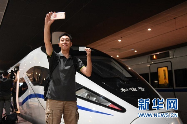 9月23日,搭乘G5711次高鐵列車前往香港西九龍站的乘客在深圳北站拍照留念。當日7時,G5736次高鐵列車從香港西九龍站發往深圳北站;6時44分,G5711次高鐵列車從深圳北站開往香港西九龍站,廣深港高鐵全線開通運營。新華社記者毛思倩攝