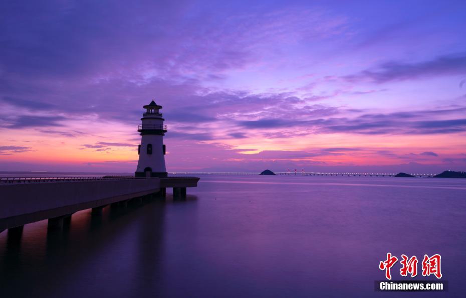 10月22日日出前,從廣東珠海的情侶路向東眺望,朝霞滿天,將遠處的港珠澳大橋映襯得格外美麗。「超級工程」港珠澳大橋將於24日上午9時正式通車。中新社記者 張煒 攝