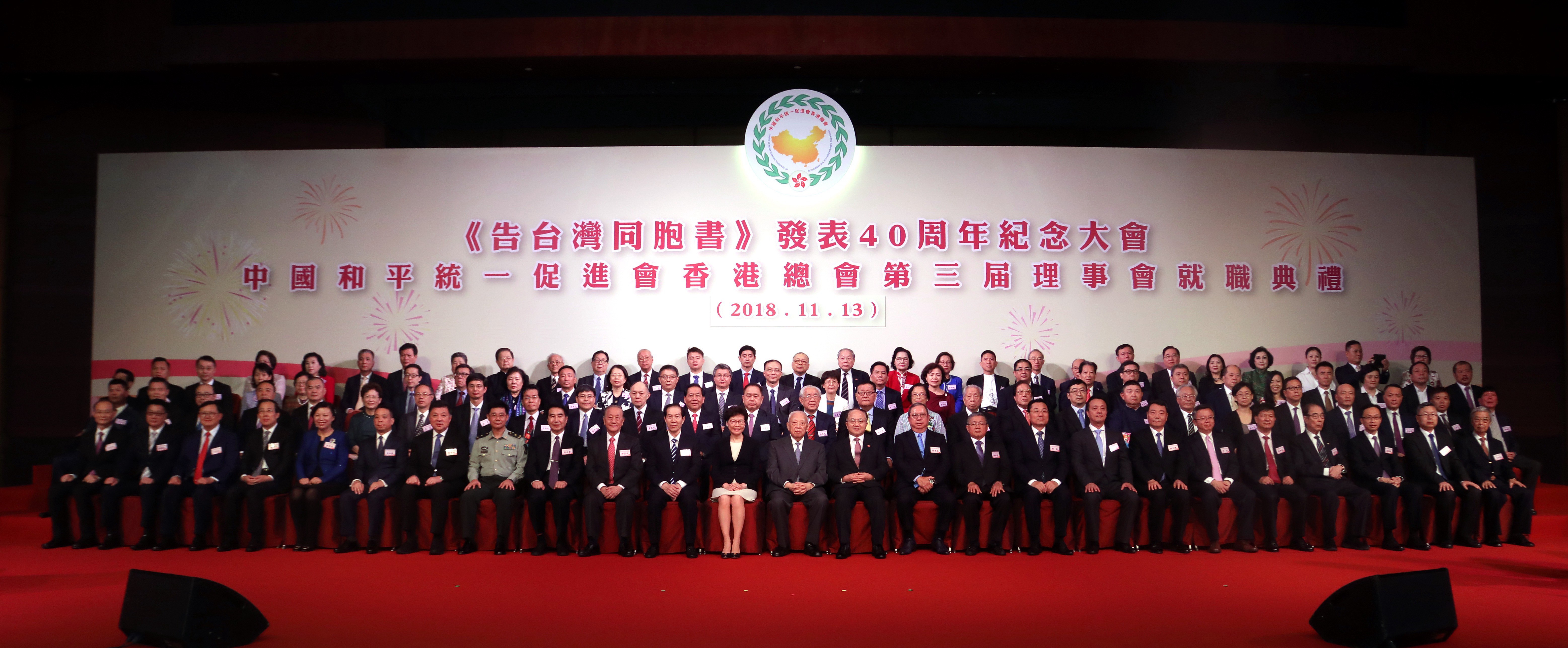 本網訊 11月13日,我辦主任王志民、副主任楊建平應邀出席中國和平統一促進會香港總會主辦的《告台灣同胞書》發表40周年紀念大會,與全國政協副主席董建華、香港特區行政長官林鄭月娥、全國台聯會長黃志賢、中央台辦副主任陳元豐、國務院港澳辦副主任黃柳權、外交部駐港特派員公署特派員謝鋒、解放軍駐港部隊副政委陳亞丁、全國僑聯副主席李波、余國春和盧文端等共同主禮,並見證中國和平統一促進會香港總會第三屆理事會就職典禮。新黨主席郁慕明、無黨團結聯盟主席林炳坤等台灣嘉賓應邀與會。來自海峽兩岸暨香港、澳門的各界代表以及海外嘉賓逾700人參加大會。