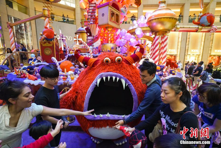 11月24日,距離聖誕節還有一個月時間,香港許多大型購物廣場開啟聖誕購物季的大幕,紛紛裝點商場,搭建聖誕裝置,營造節日氣氛,以招攬更多顧客光臨。圖為位於中環的置地廣場中庭變身「巧克力工廠」,大嘴怪等各種怪獸吸引顧客拍照留念。中新社記者 張煒 攝