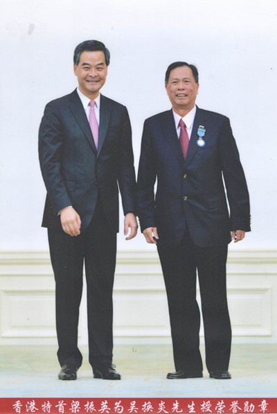 因積極參與社會服務,尤其對福建社群貢獻良多,2013年,吳換炎獲香港特區政府頒發榮譽勳章。圖為時任香港特首梁振英為吳換炎授勳。