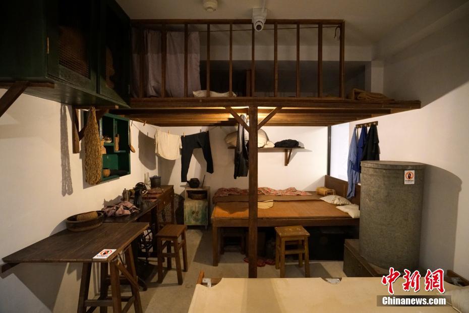 美荷樓內每個房間面積均為120平方呎(約11平方米),當年安置首批居民時,一間屋至少居住5名成年人,每戶月租為10港元。圖為根據1950年代范氏一家六口居住的美荷樓271室重建的展室,四名兒女住在低矮的「閣仔」裏,而右邊的鐵桶既是儲物櫃又是臨時「梯子」。中新社記者 張煒 攝