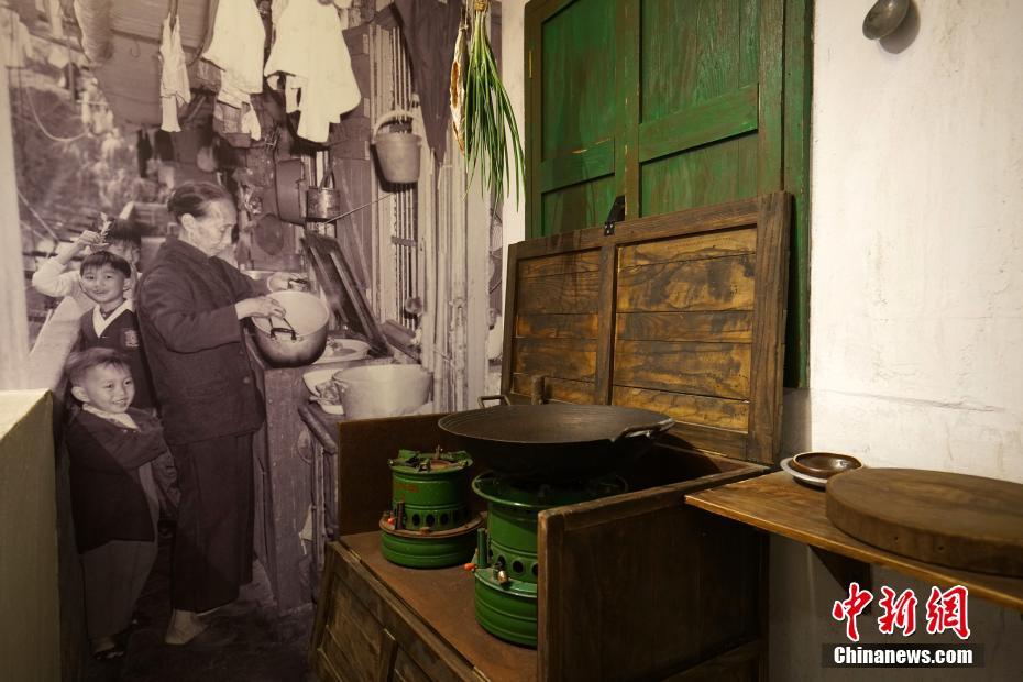 1950年代的美荷樓沒有獨立廚房,居民多在走廊狹小的空間生火做飯。圖為當年的照片和實物陳列。中新社記者 張煒 攝