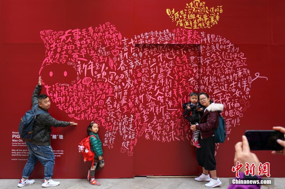 1月27日,農曆新年臨近,香港街頭喜慶氣氛越來越濃。一面由各種吉祥話、祝賀語組成的「字字『豬』璣」墻亮相灣仔利東街,吸引游客拍照留念。中新社記者 張煒 攝
