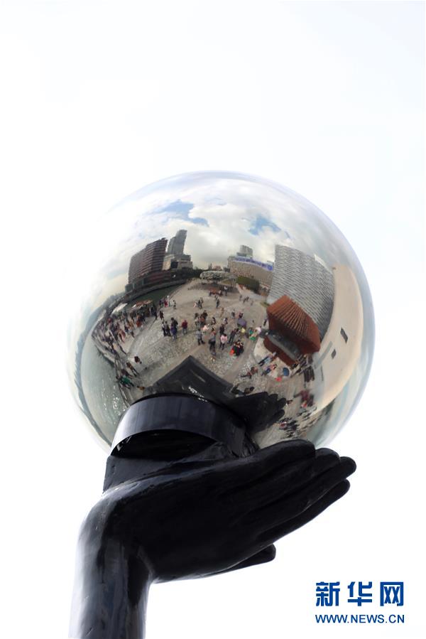 金像獎銅像手持的「明珠」倒映出重新開放的星光大道(1月31日攝)。 新華社記者 吳曉初 攝