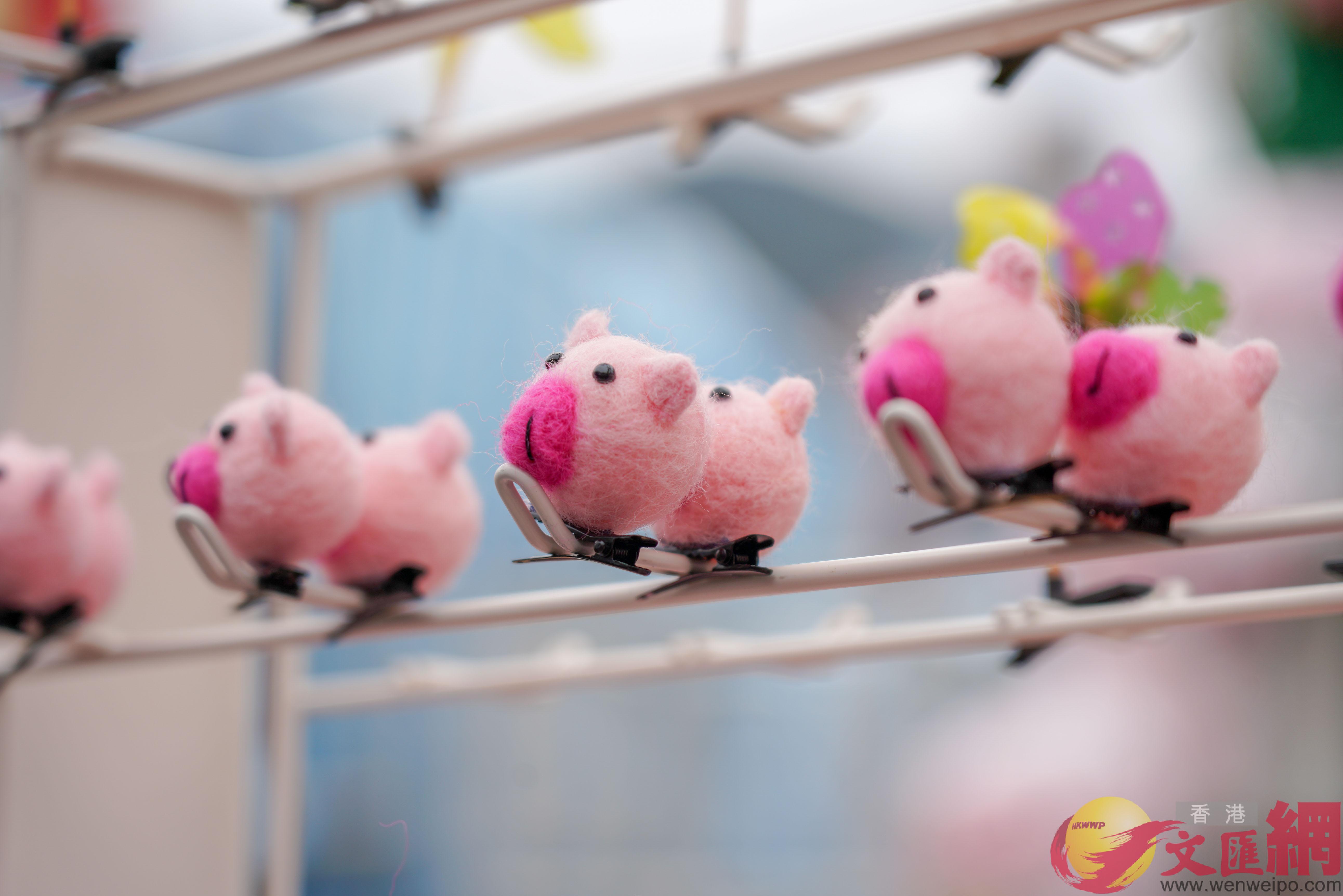 為迎接豬年到來,香港維多利亞公園年宵花市的不少攤位都有「豬」多搞作,推出以豬為題材的特色貨品,大收旺場。有攤檔販賣的「真豬」奶茶抱枕,睇得又攬得,盡顯無限創意。(大公文匯全媒體記者 李湃豐 攝)