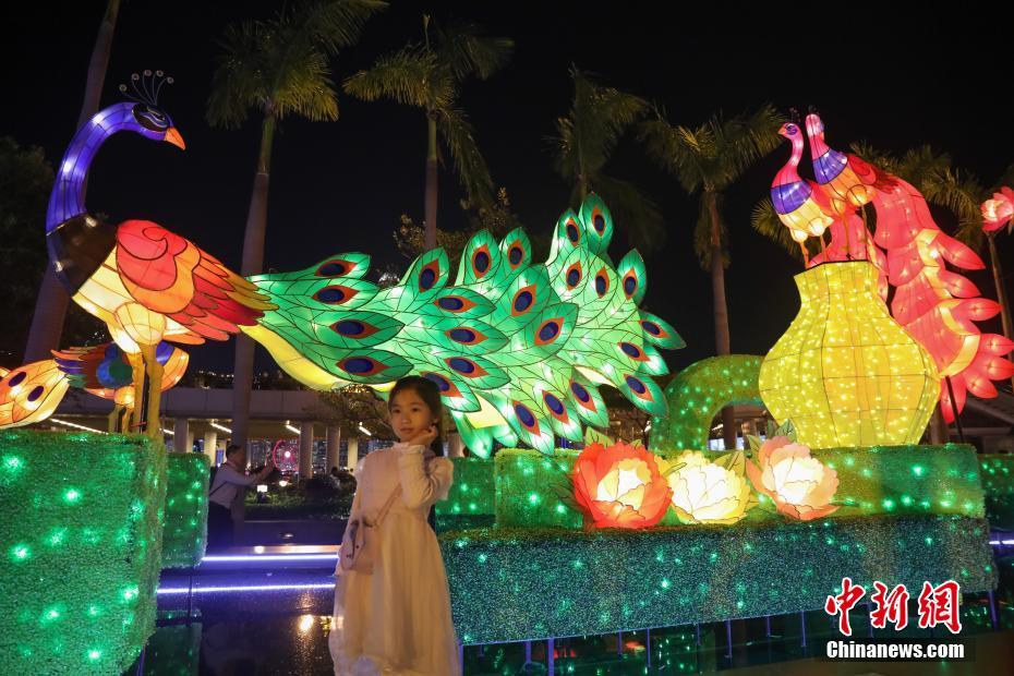 2月13日,元宵佳節將至,香港節日氣氛正濃。一組以中國傳統吉祥鳥孔雀為主題的「雀屏春瑞耀香江」春節專題綵燈展在毗鄰維港的香港文化中心露天廣場舉行,展示超過十組形態各異的孔雀。圖為小朋友在燈飾前「打卡」拍照。中新社記者 謝光磊 攝