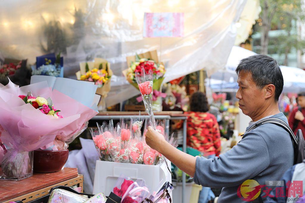 今日(14日)情人節,不少人選擇以花束表達心意,旺角花墟就擠滿前來選購情人節花束和年花的市民。不少花店已由年花主題變為情人節主題,店舖擺放出各式各樣的情人節花束設計,吸引不少男士查詢及預訂。有男士表示,300多元起跳的花束已是最基本消費,雖然已經結婚,但還是想給太太一個驚喜。(大公文匯全媒體記者 李湃豐 攝)