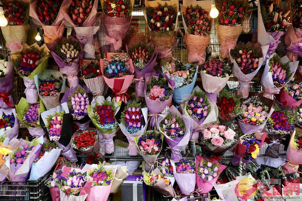 今日(14日)情人節,不少人選擇以花束表達心意,旺角花墟就擠滿前來選購情人節花束和年花的市民。不少花店已由年花主題變為情人節主題,店舖擺放出各式各樣的情人節花束設計,吸引不少男士查詢及預訂。有男士表示,300多元起跳的花束已是最基本消費,雖然已經結婚,但還是想給太太一個驚喜。(大公文匯全媒體記者 李湃豐 攝)
