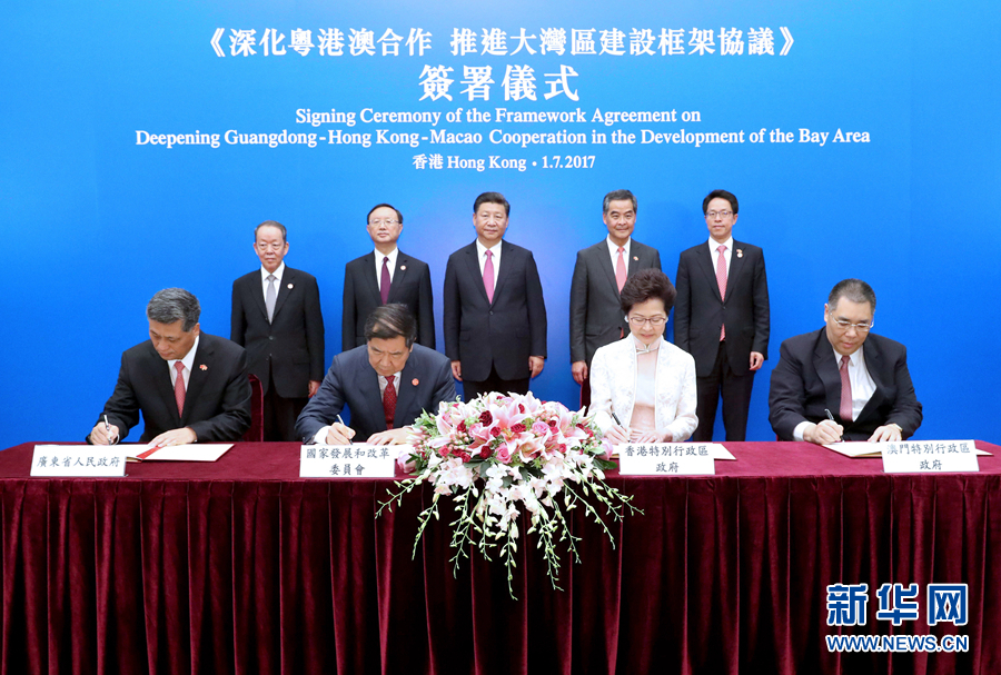 2017年7月1日,在習近平主席親自見證下,國家發展改革委和粵港澳三地政府在香港共同簽署《深化粵港澳合作 推進大灣區建設框架協議》。習總書記作出重要指示,要求把這件大事辦好。幾個月後,粵港澳大灣區建設被寫入黨的十九大報告。