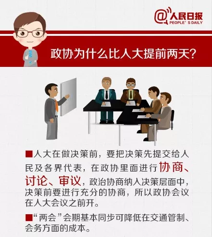 一般而言,政協會議比人大會議提前召開一至兩天,這主要是為了保證政協履行其職能。政協主要職能是政治協商、民主監督和參政議政。
