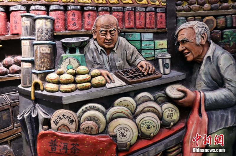 香港西營盤站浮雕壁畫包括具「老西環」特色的海味乾貨店、日用品雜貨店及街市等舊式店舖。中新社記者 洪少葵 攝