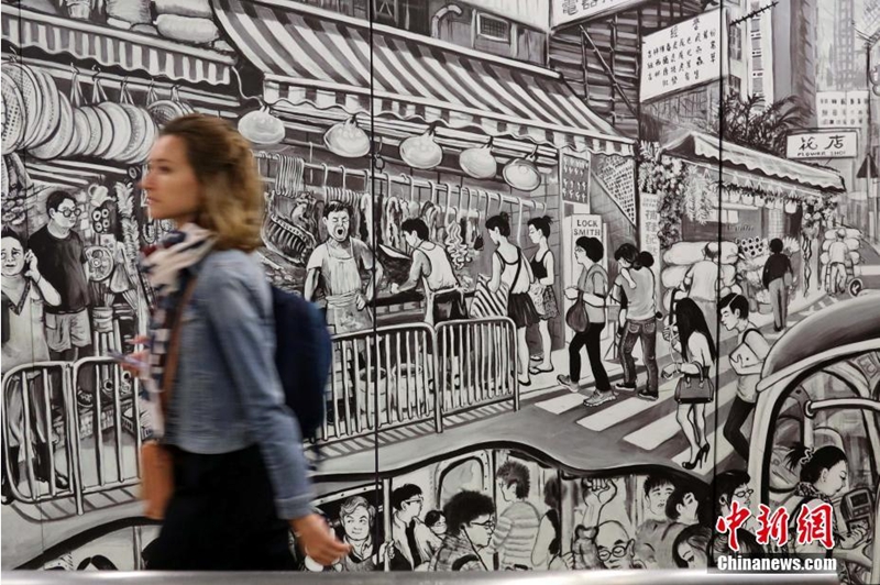 香港「藝術氣息最濃厚」的港鐵西營盤站,站內玲瓏浮凸的壁畫常常吸引南來北往的乘客。中新社記者 洪少葵 攝