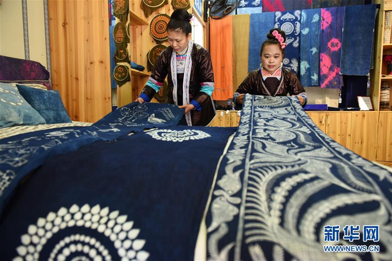 3月12日,在貴州省黎平縣侗品源傳統工藝農民專業合作社,侗族婦女在整理文創旅遊商品。 新華社記者 楊文斌 攝