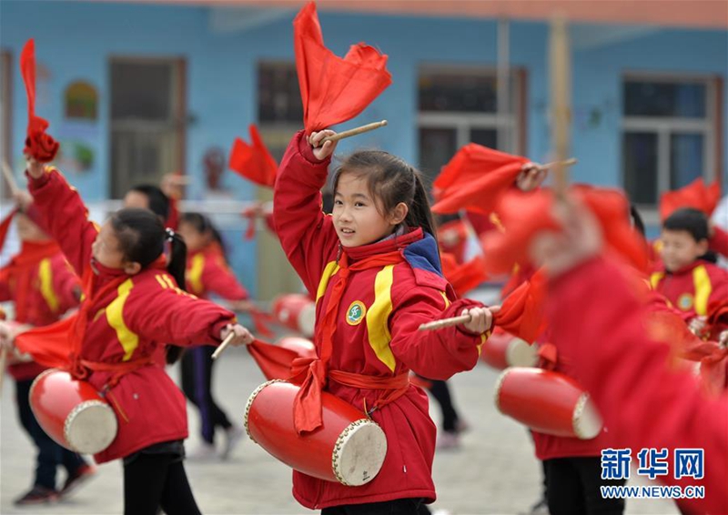 3月20日,河北邢台經濟開發區百泉小學學生在練習打腰鼓。 新華社記者 朱旭東 攝