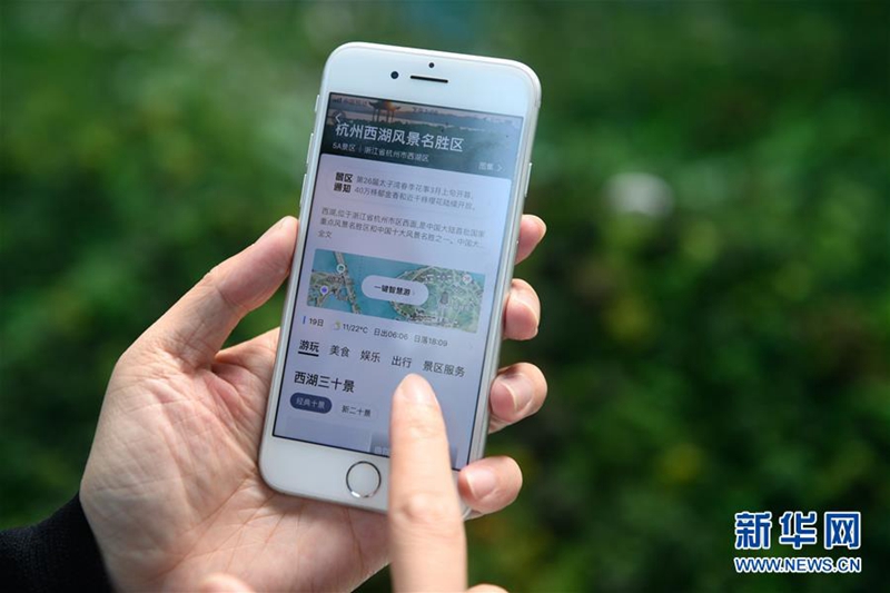 3月19日,在浙江杭州,游客使用手機體驗「西湖一鍵智慧游」服務。 新華社記者 黃宗治 攝