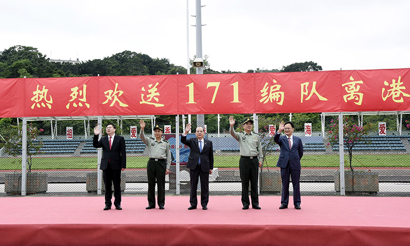 我辦副主任陳冬與特區政府政務司司長張建宗,外交部駐港特派員公署副特派員宋如安,駐港部隊司令員陳道祥、政委蔡永中,以及香港社團、青少年代表和駐港部隊官兵代表等500餘人出席歡送儀式。