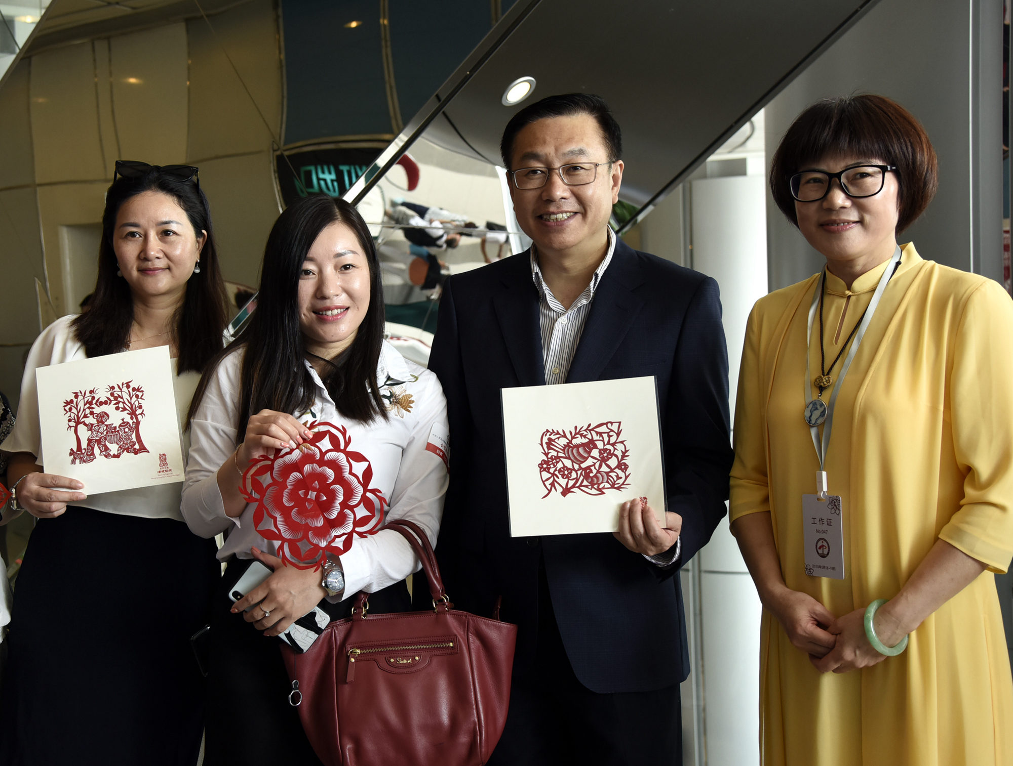 何靖副主任參觀剪紙展台並與來賓合影。(圖片來源:中央政府駐港聯絡辦)