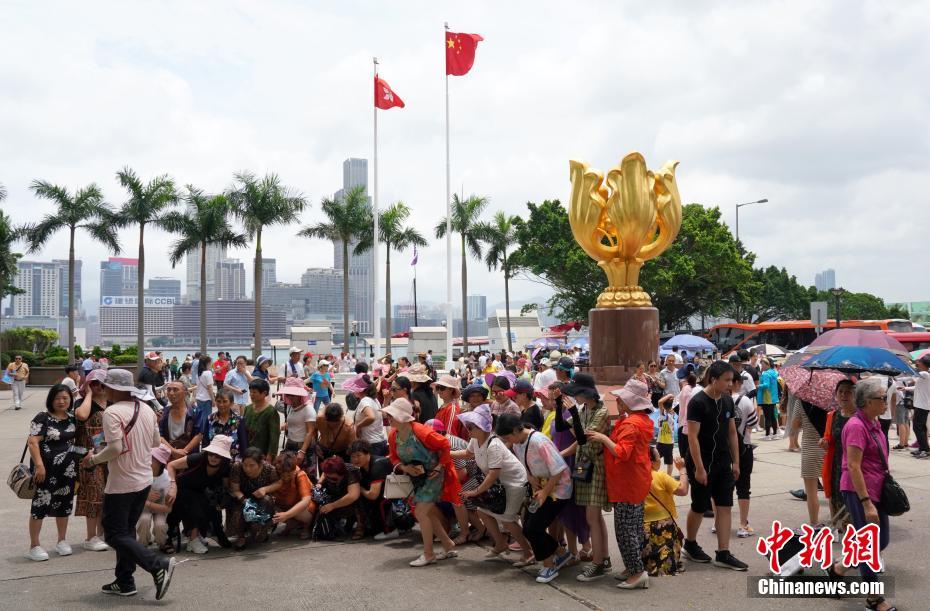 7月9日,眾多中國內地游客在香港金紫荊廣場觀光拍照。隨着暑期到來,香港旅遊業預計將逐漸升溫。中新社記者 張煒 攝