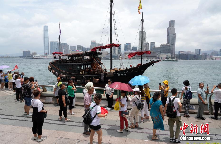 7月9日,眾多中國內地游客在香港金紫荊廣場附近的海濱觀光拍照。隨着暑期到來,香港旅遊業預計將逐漸升溫。中新社記者 張煒 攝