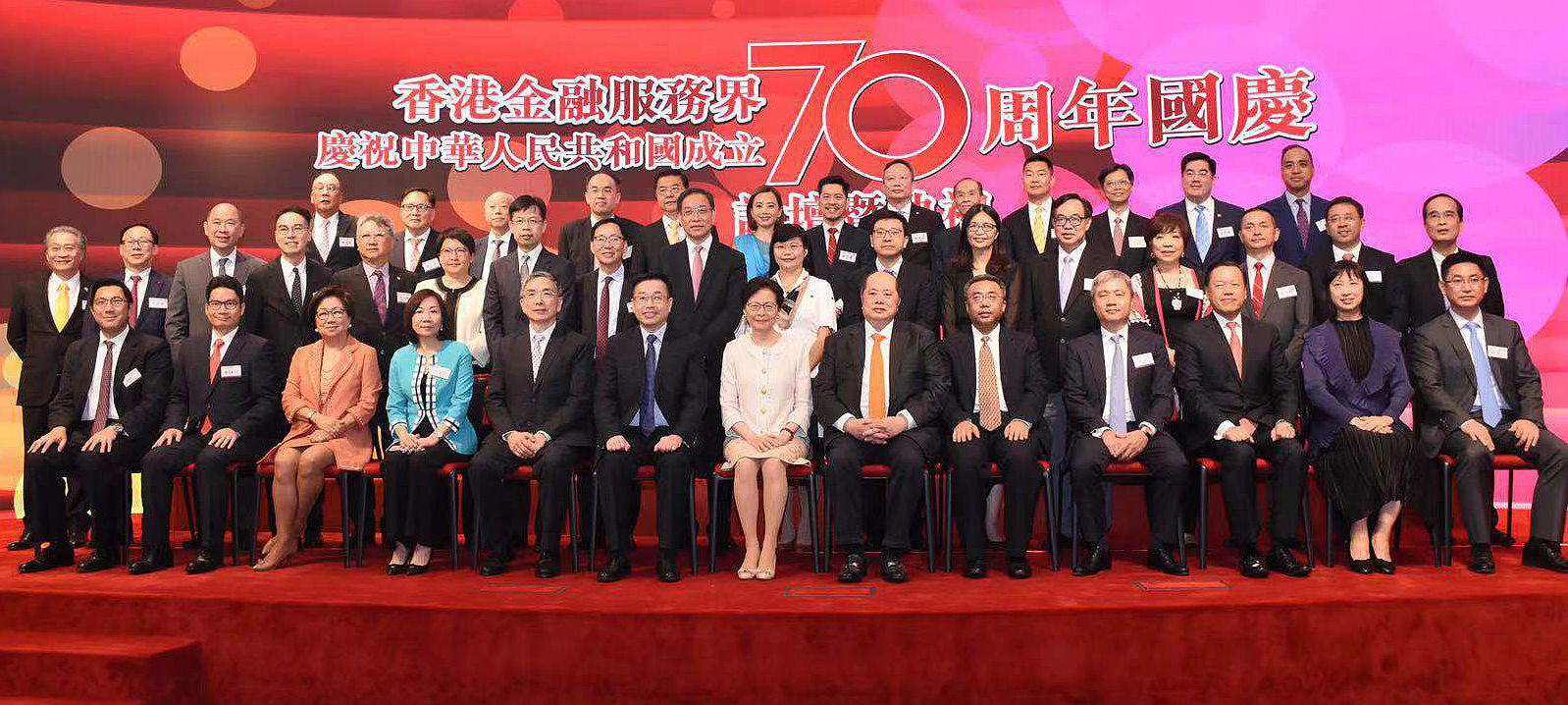 本網訊 9月10日,我辦副主任何靖應邀出席香港金融服務界慶祝中華人民共和國成立70周年國慶典禮,並與香港特區行政長官林鄭月娥、外交部駐港特派員公署副特派員楊義瑞、特區政府財政司司長陳茂波、財經事務及庫務局局長劉怡翔、香港證監會主席雷添良、香港交易所主席史美倫等共同主禮。