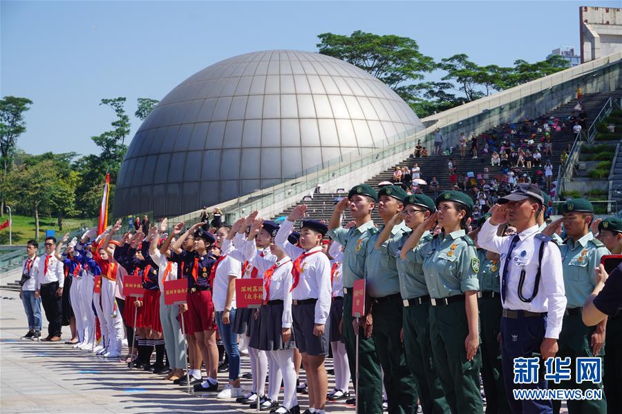 「五星紅旗迎風飄揚,勝利歌聲多麼響亮……」伴隨着朝氣蓬勃的歌聲,一面巨大的五星紅旗在深圳紅領巾廣場徐徐鋪開。9月21日,300多名深港青少年共同進行升旗儀式、中式步操展示等活動,表達對新中國成立70周年的祝福。