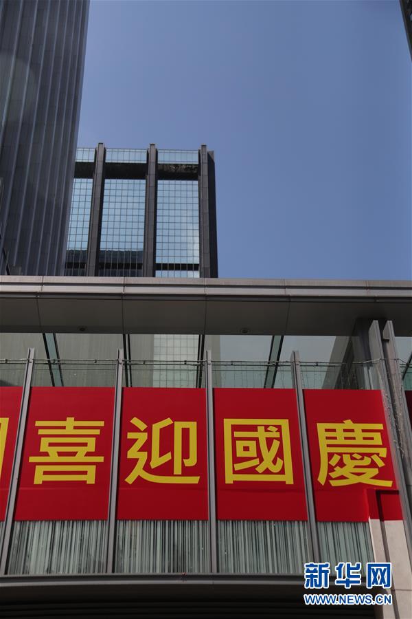 這是9月24日在香港告士打道上拍攝的國慶標語。國慶節將至,香港街頭懸挂國旗,張貼國慶標語,慶祝中華人民共和國成立70周年。(新華社 盧燁 攝)