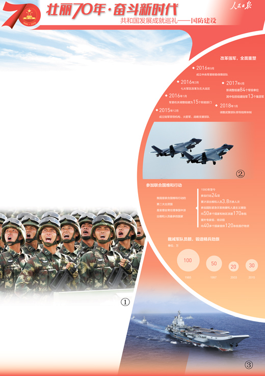 70年來,國防實力由弱到強,發生質的飛躍,躍居世界前列;人民軍隊由大到強,發展成為諸軍兵種聯合、基本實現機械化、加快邁向信息化的強大軍隊,國防和軍隊現代化建設站在了新的起點上。70年來,圍繞推動軍隊由數量規模型向質量效能型、由人力密集型向科技密集型轉變,人民軍隊在黨的絕對領導下,進行多次調整改革,軍隊組織形態持續轉型升級。70年來,國防軍費適度穩步增長,國防工業體系日臻完善,相繼自行研製出一大批先進武器裝備,實現從常規到尖端、從騾馬化摩托化到機械化信息化的歷史性跨越。70年來,我軍全面履行保家衛國、保衛人民的職能,堅決打擊一切形式分裂破壞活動,積極參與聯合國維和行動,為國家安全與世界和平作出重大貢獻。
