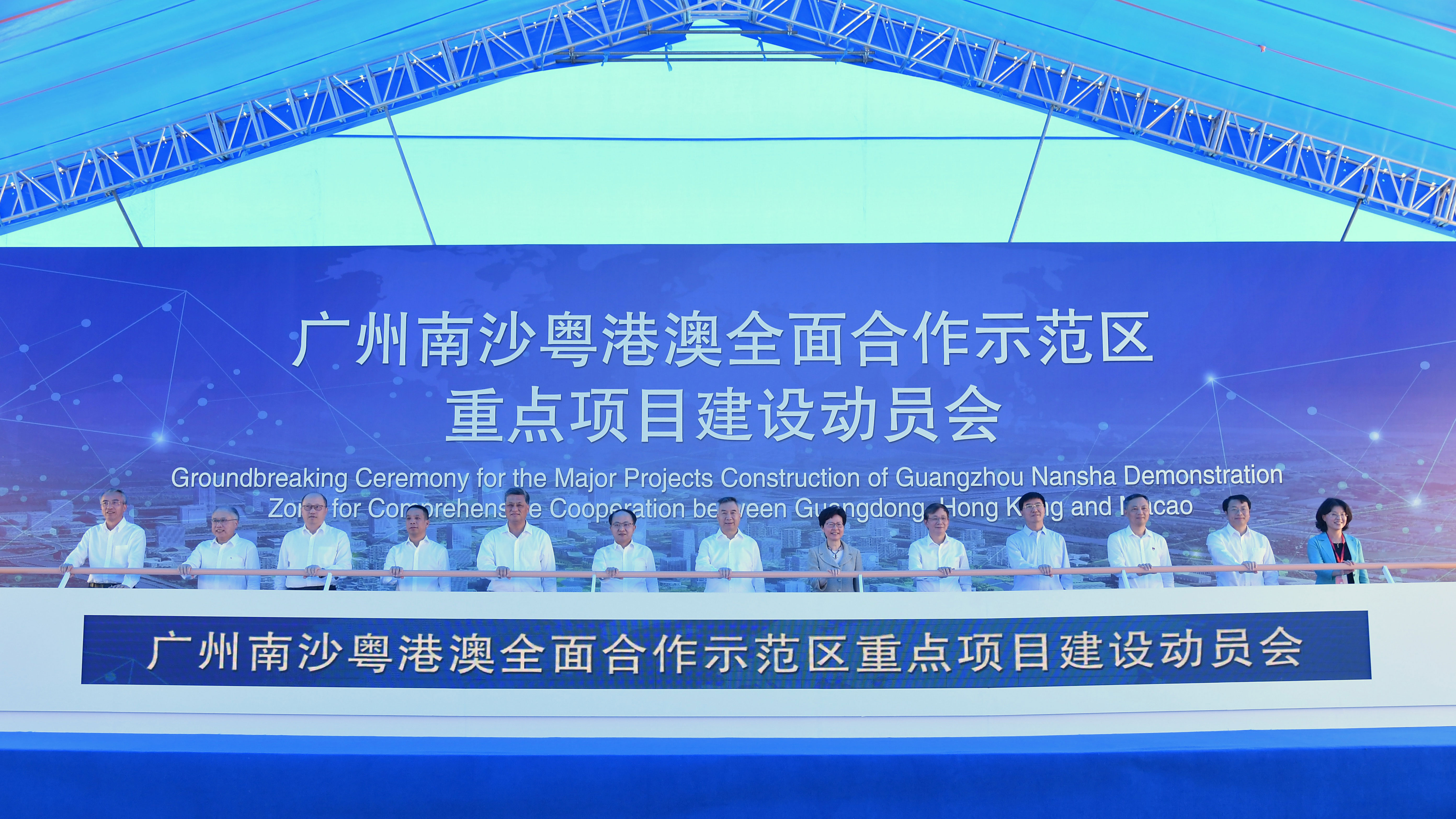 本網訊 9月26日上午,廣州南沙舉行粵港澳全面合作示範區重點項目建設動員會。廣東省委書記李希、香港特區行政長官林鄭月娥、我辦主任王志民,廣東省委副書記、省長馬興瑞,以及教育部、國家發改委、國務院港澳辦、中科院、廣州市和香港科技大學等相關負責人出席大會,共同為香港科技大學(廣州)、中國科學院明珠科學園兩大項目主禮開工儀式。