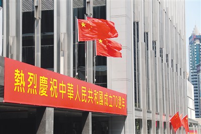 國慶節將至,香港街頭懸挂國旗,張貼國慶標語,慶祝中華人民共和國成立70周年。圖為在香港告士打道上拍攝的國旗與國慶標語。(新華社 盧 燁 攝)