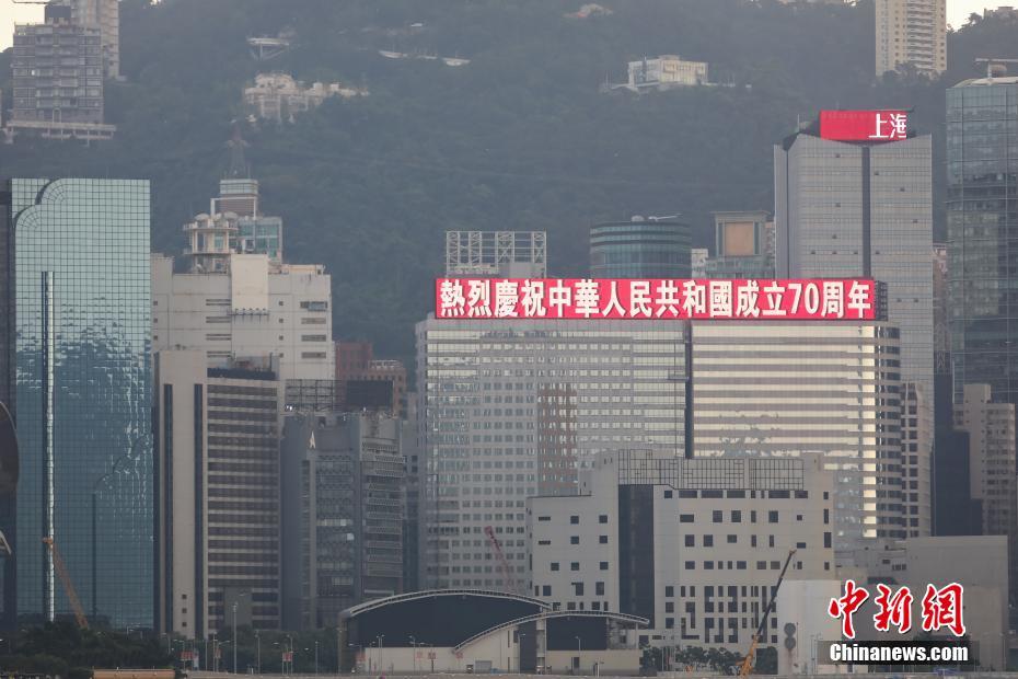 9月25日,為慶祝中華人民共和國70華誕,香港維多利亞港兩岸多座標誌性建築打出「熱烈慶祝中華人民共和國成立70周年」等標語。(中新社 謝光磊 攝)