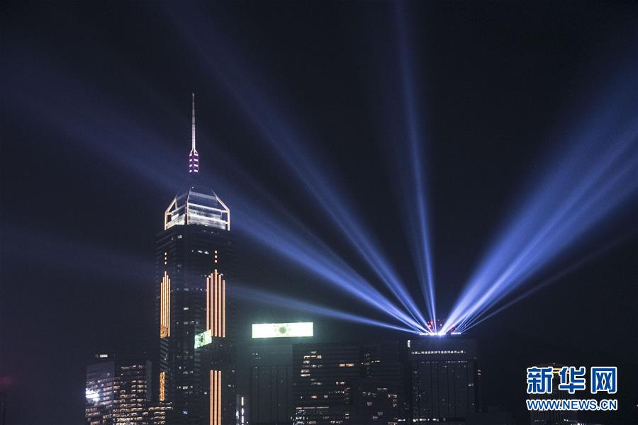 這是9月27日拍攝的香港灣仔附近夜景。國慶將至,香港維多利亞港兩岸燈光璀璨、流光溢彩,一派喜慶氣氛。(新華社 盧燁 攝)