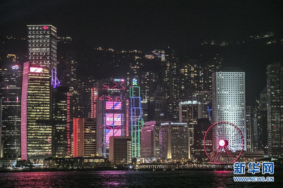 這是9月27日拍攝的香港中環附近夜景。國慶將至,香港維多利亞港兩岸燈光璀璨、流光溢彩,一派喜慶氣氛。(新華社 盧燁 攝)