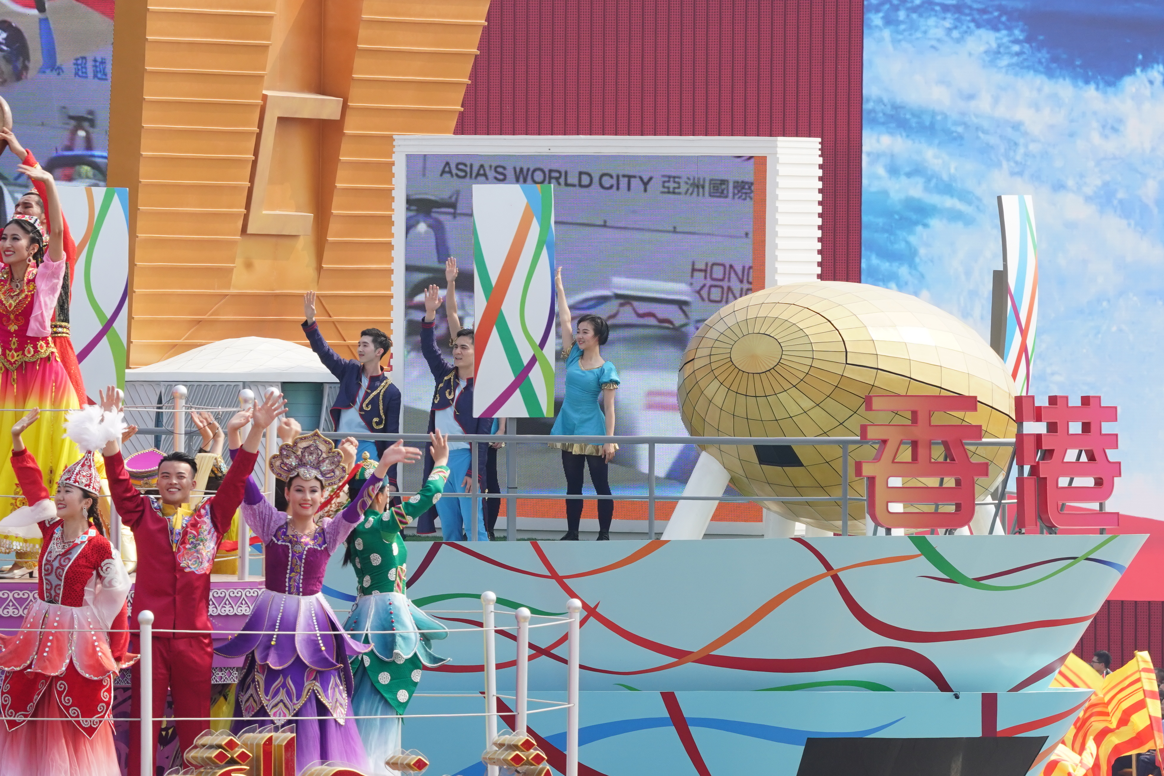 10月1日上午,慶祝中華人民共和國成立70周年大會在北京天安門廣場隆重舉行。這是群眾游行中的「香港,進」彩車。(新華社 殷剛 攝)