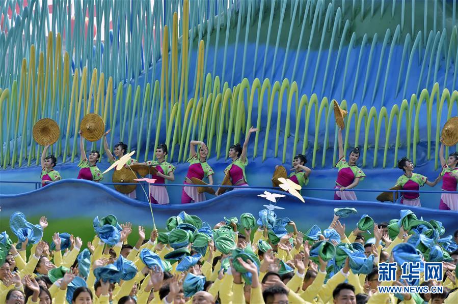 10月1日上午,慶祝中華人民共和國成立70周年大會在北京天安門廣場隆重舉行。這是群眾游行中的「綠水青山」方陣。(新華社 周華 攝)
