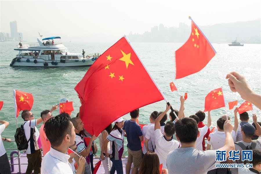 10月1日,香港市民在維多利亞港參加巡游。當日,約300名香港市民以遊船方式慶祝新中國成立70周年。(新華社 翁忻旸 攝)