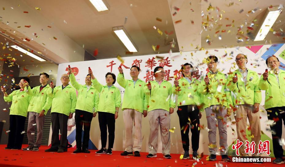 11月3日,「千人賀華誕 龍躍健步行」在香港培僑小學舉行起步禮。外交部駐港特派員公署特派員謝鋒(中)、香港中聯辦副主任仇鴻(左五)、中企協會長高迎欣(右五)、新社聯理事長、民建聯副主席陳勇(左四)等嘉賓出席起步儀式。當天,超過50家中資企業及其他商會組織代表等愈一千人參與健步行活動,用健康向上的方式慶祝新中國70周年華誕,同時期盼香港能夠早日走出困境,重新出發。(中新社 洪少葵 攝)