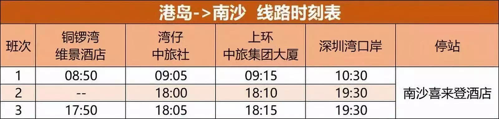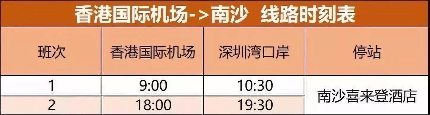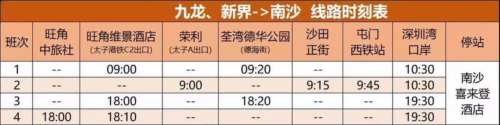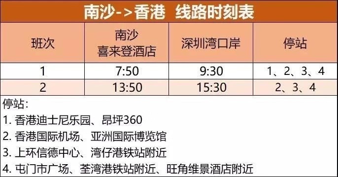 目前,南沙至香港發車時間為每日早晨7:50和下午13:50,沿途可停靠香港迪士尼樂園、昂坪360、香港國際機場、亞洲國際博覽館、上環信德中心、灣仔港鐵站、屯門市廣場、荃灣港鐵站、旺角維景酒店等地。香港居民亦可在上述站點乘坐巴士。