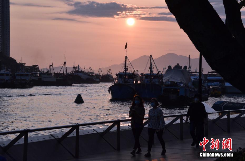3月23日黃昏,途人經過香港仔海濱。從香港黃竹坑沿着海濱往香港仔方向,內海的避風塘黃昏景色宜人,時常吸引不少市民到此觀賞。(中新社 洪帆 攝)