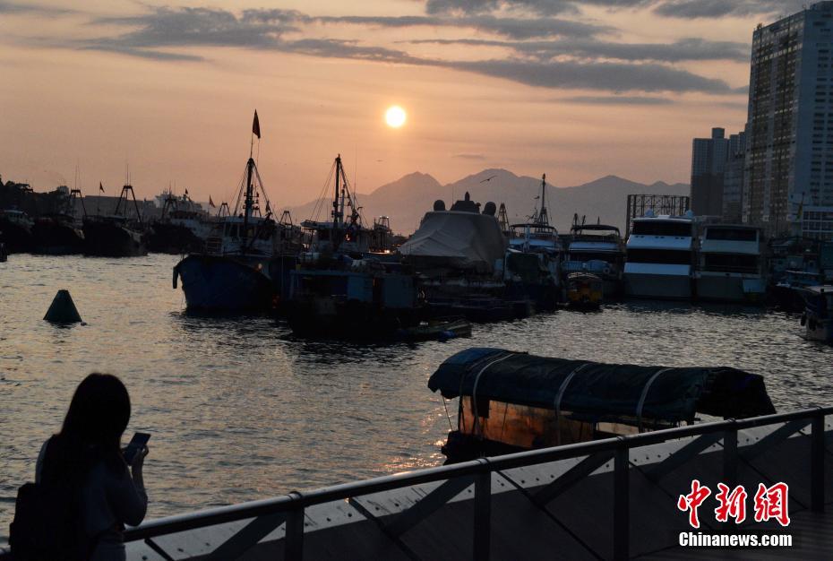 3月23日,香港仔海濱的日落美景。從香港黃竹坑沿着海濱往香港仔方向,內海的避風塘黃昏景色宜人,時常吸引不少市民到此觀賞。(中新社 洪帆 攝)