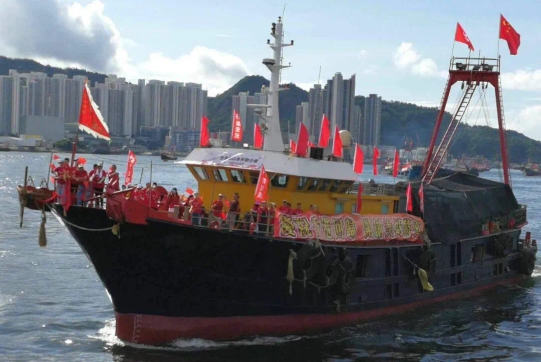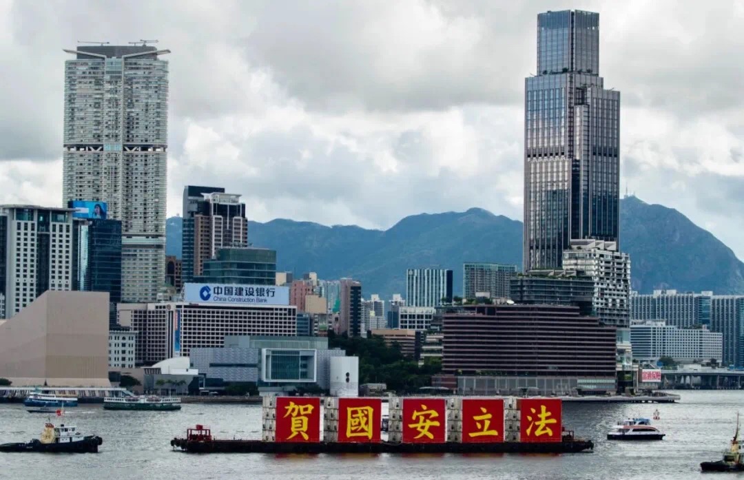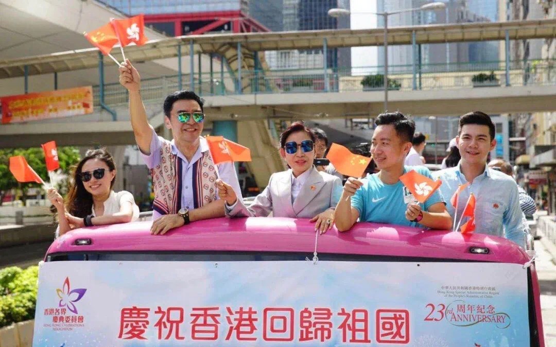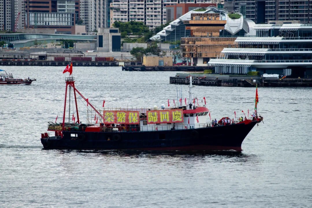 7月1日,超過100艘懸挂國旗、區旗及「賀國安立法」主題橫幅的漁船,由香港仔出發巡游至中環碼頭。巴士花車和的士也在全港巡游。