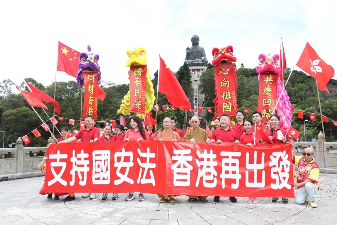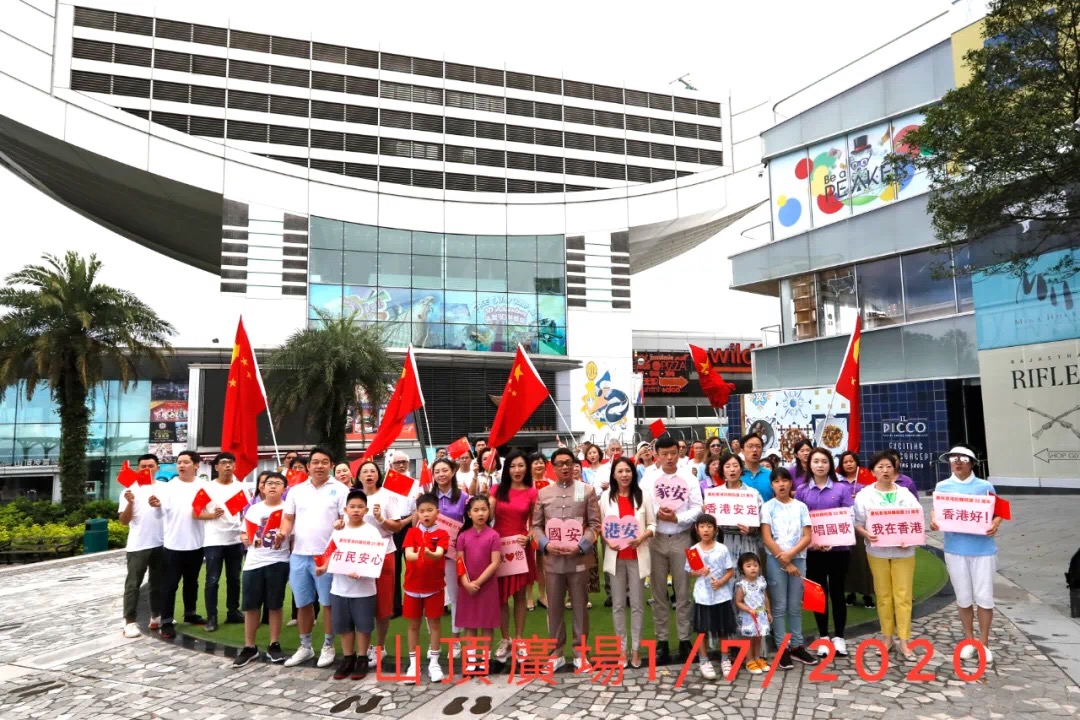 7月1日,香港市民在山頂廣場、天壇大佛廣場、中環摩天輪等多個地標高唱國歌,表達慶祝香港回歸,支持國安立法的共同心聲。