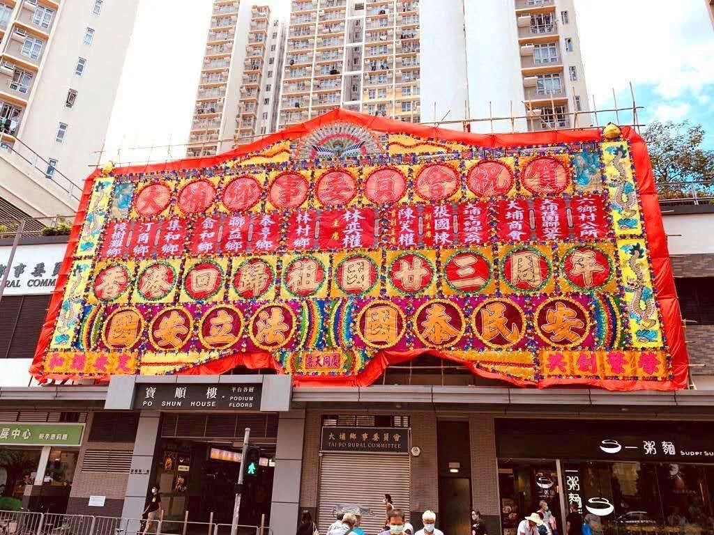 7月1日,香港新界大埔、沙田、元朗、荃灣等地區鄉民,紛紛在交通交匯處以及醒目顯眼位置,以香港獨特的傳統手工藝,高高展示富有新界傳統特色的巨型絢麗花牌,向祖國、向香港表達美好的祝福。