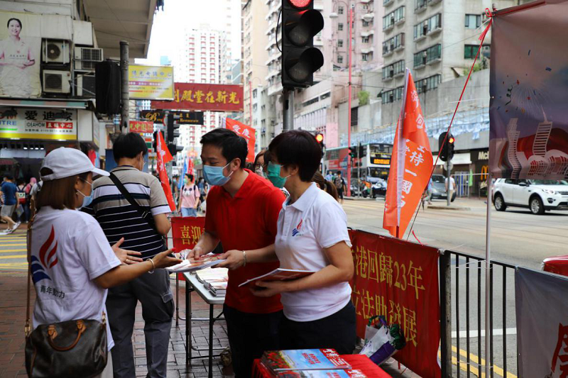紫荊雜誌社聯合地區義工在北角新光戲院門口舉行「慶香港回歸 賀國安立法」活動,現場向市民派發香港國安法宣傳冊、紫荊雜誌、基本法頒佈30周年特刊等物品,義工團隊亦在現場向市民宣傳講解國安法,路過市民紛紛駐足了解並點讚。