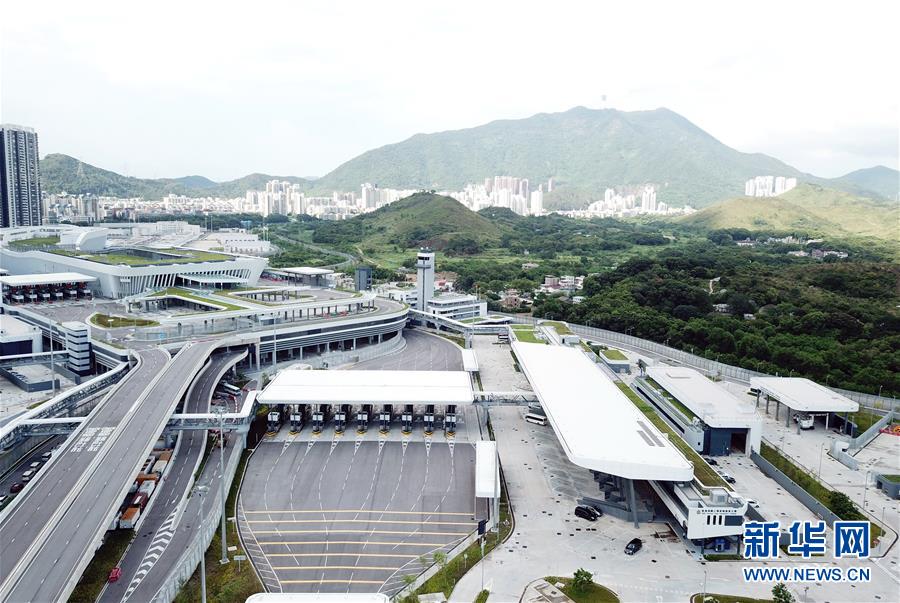 這是8月26日拍攝的蓮塘/香園圍口岸(無人機照片)。 8月26日10時許,隨着貨檢通道閘口打開,深港兩地貨車緩緩通過閘口,深港間第七座陸路口岸——蓮塘/香園圍口岸正式開通,粵港澳大灣區再添一條新物流大通道。(新華社記者 李鋼 攝)